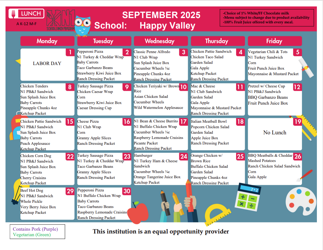 September Lunch Menu by HVS | Aug 20, 2025 | Announcements Share this: Click to share on Facebook (Opens in new window) Facebook Click to share on X (Opens in new window) X Click to email a link to a friend (Opens in new window) Email Click to print (Opens in new window) Print More Click to share on LinkedIn (Opens in new window) LinkedIn Click to share on Pinterest (Opens in new window) Pinterest Click to share on Tumblr (Opens in new window) Tumblr Click to share on Reddit (Opens in new window) Reddit
